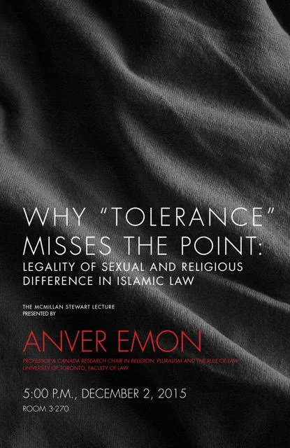 Why 'Tolerance' Misses the Point: Legality of Sexual and Religious Difference in Islamic Law Wednesday, December 2, 2015 5:00 PM 7:00 PM Google Calendar ICS Anver Emon, Professor and Canada Research Chair in Relligion, Pluralism and the Rule of Law, University of Toronto, Faculty of Law, Wednesday, December 2, 5 PM Bldg 3 Room 270